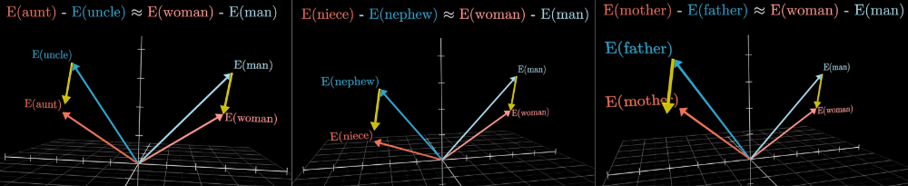 Although this is a classic example, Queen seems a bit far off. This can be explained by the fact that the embedding also holds other meanings for the word queen (the band, the LGBT slang, etc). The gender dimension is better illustrated by family relations: