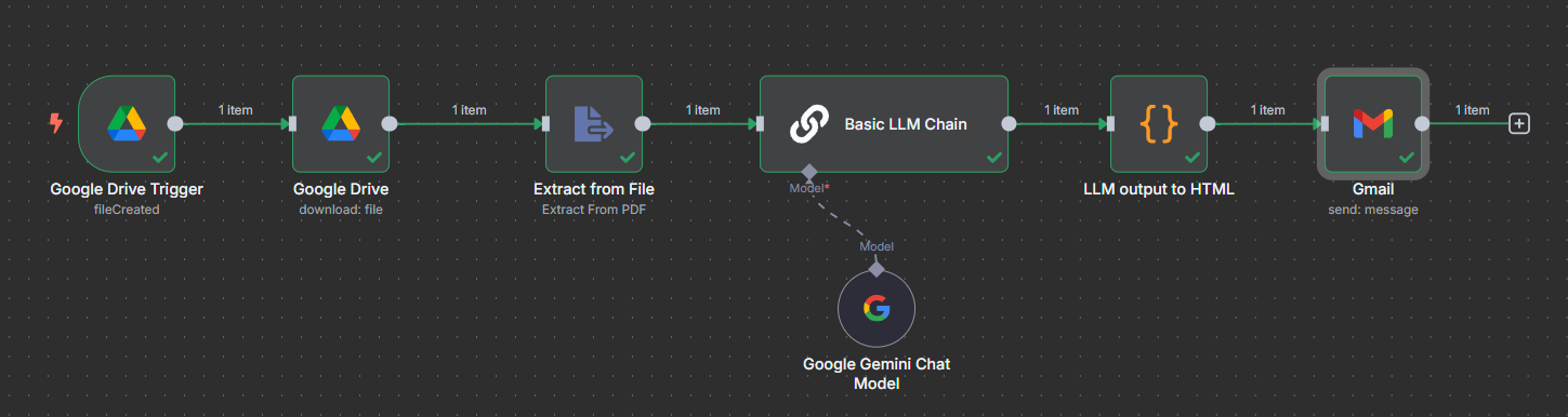 This sequence demonstrates the true power of n8n: seamlessly combining diverse functionalities (file management, text extraction, AI processing, data formatting, and email sending) into a single, automated, and intelligent workflow.