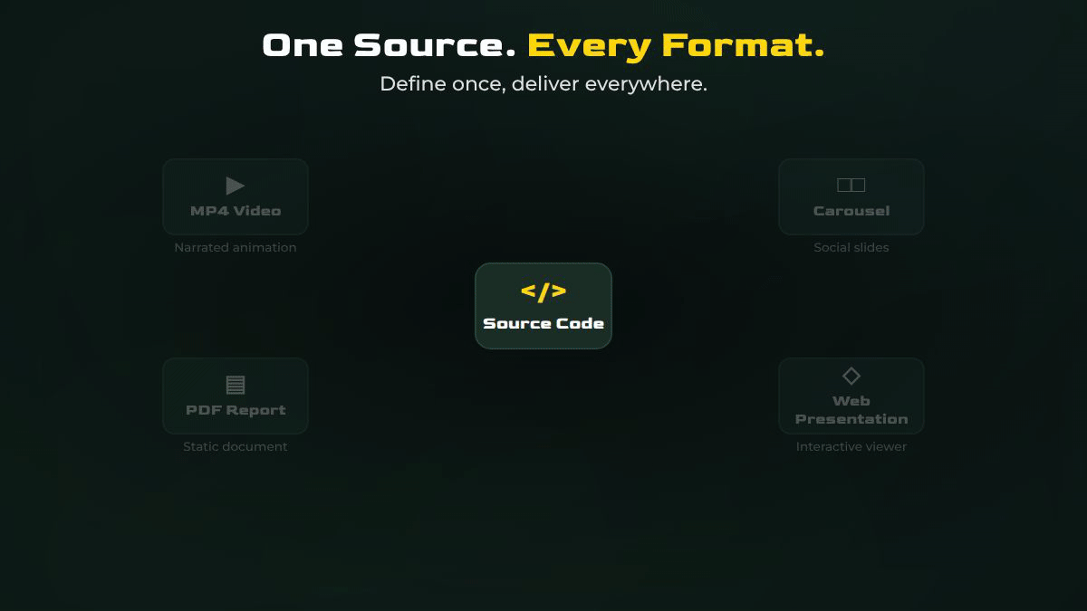 The same components that produce an animated video can render static slides for a carousel or a PDF. They can be served as an interactive web presentation where the viewer clicks through at their own pace. They can generate thumbnail images for social media.