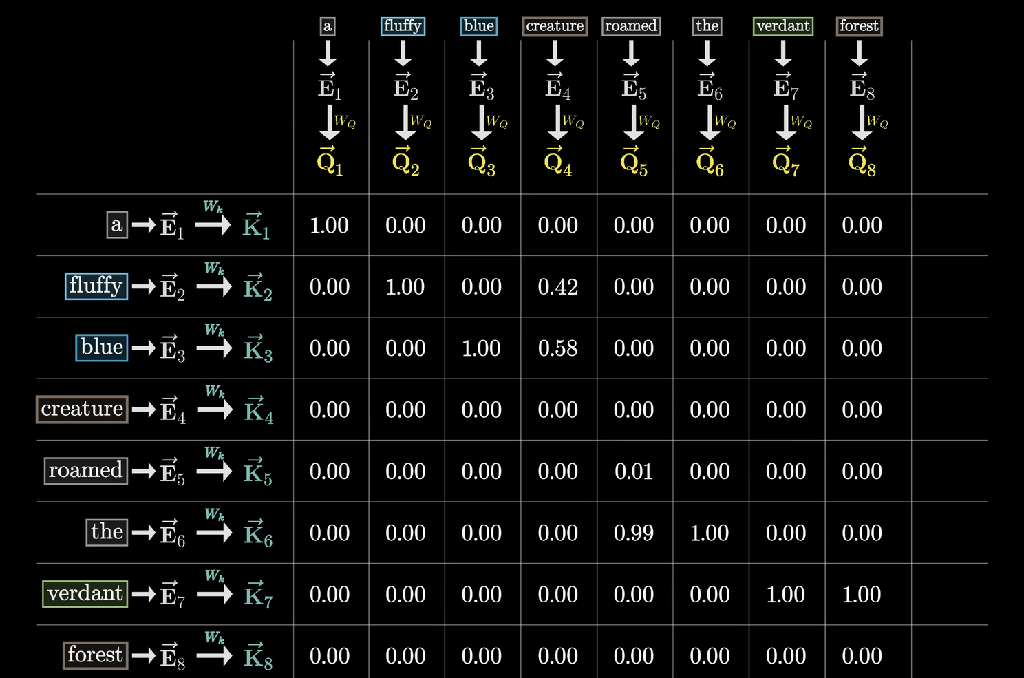 By asking the query (Q) questions for each word, and then identifying which other words are key (K) to answer the question, the model is able to update the value (V) of the word to reflect its new understanding: