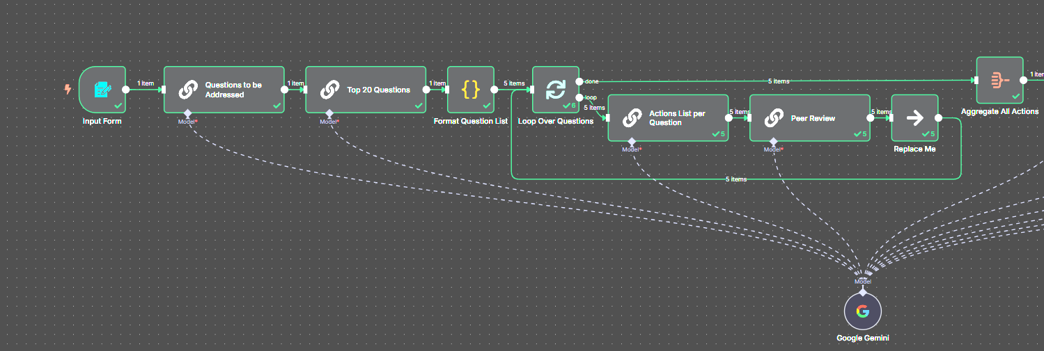 Looping Through Key Questions: The workflow iterates through each of the prioritized critical questions. AI Proposes Actions (example prompt): For each question, an AI persona (e.g., "Experienced Management Consultant") generates a concise list of primary actions to explore that specific question, explaining why each action is crucial. AI "Peer Reviews" Actions (example prompt): The proposed action plan for that single question is then passed to another AI, acting as a "Critical Friend" or QA expert. This AI reviews the plan, suggests improvements, adds comments, and aims for pragmatic enhancements, preserving sound original actions.