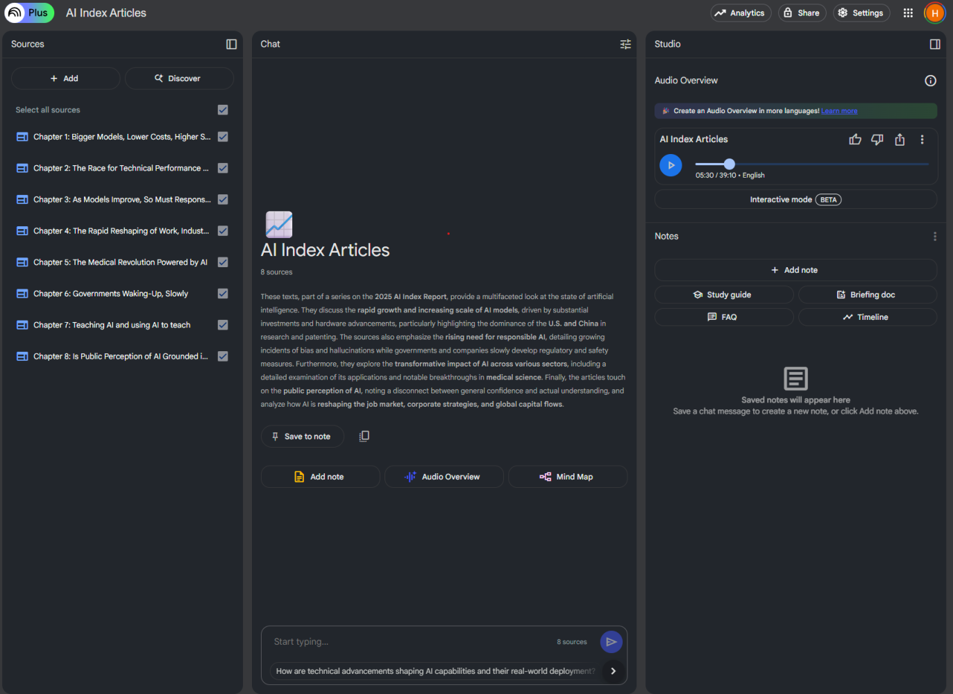 I recently wrote deep-dive articles on each chapter of the AI Index report, which offers a comprehensive look at global AI trends. Using NotebookLM, I compiled these articles into a narrated podcast covering the full report. The result is surprisingly professional and incredibly useful for people who prefer to learn by listening.