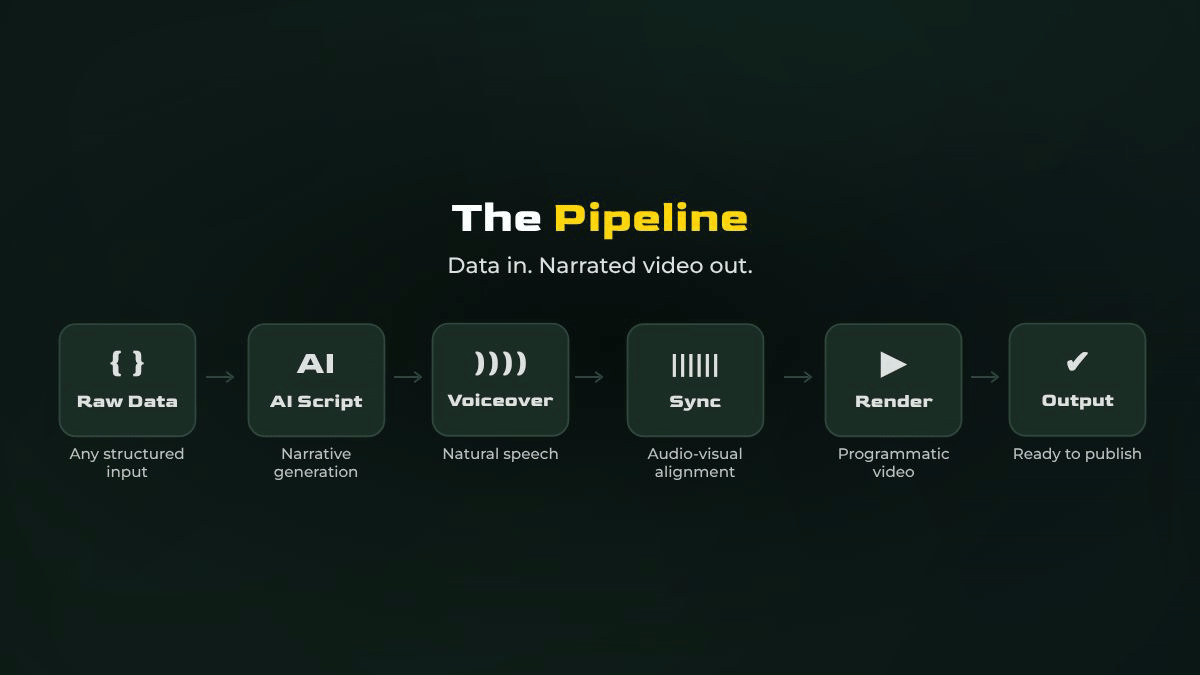 What if that entire process was a pipeline? Data goes in one end. A narrated, animated video comes out the other end. No editor. No timeline. No manual sync. Just code that produces content on demand.