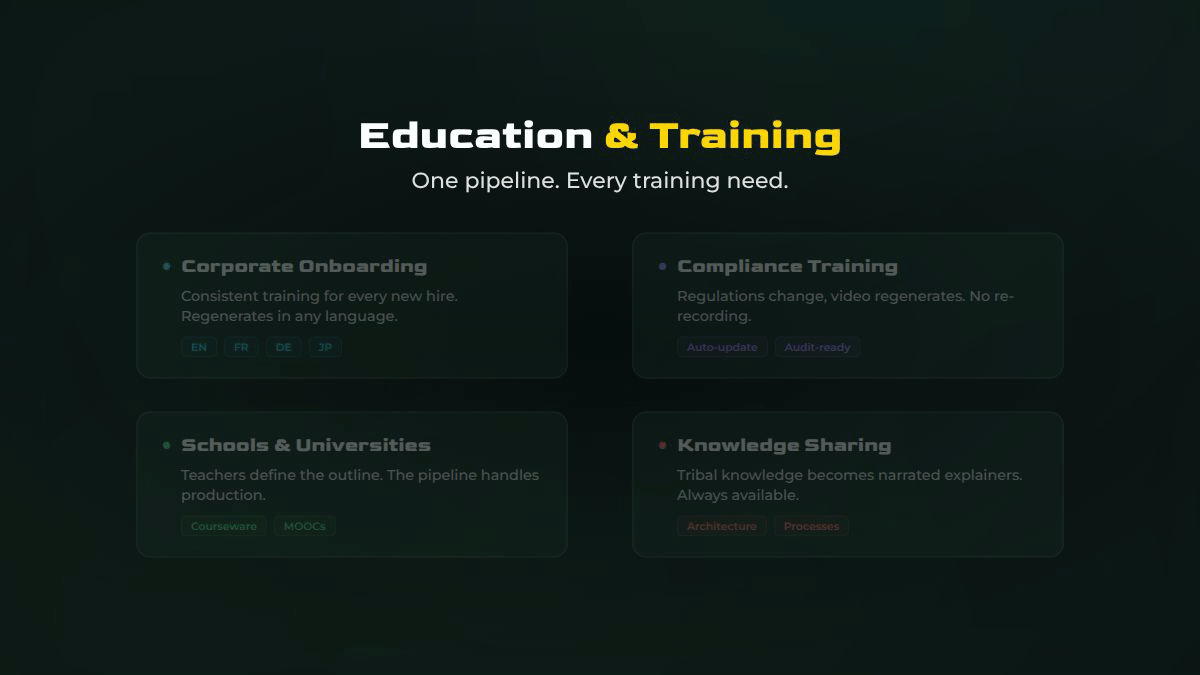 A narrated animated video is more engaging than a slide deck by default. But more importantly, it's reproducible. When regulations change, you update the content and regenerate. No re-recording. No re-editing. The pipeline handles it.